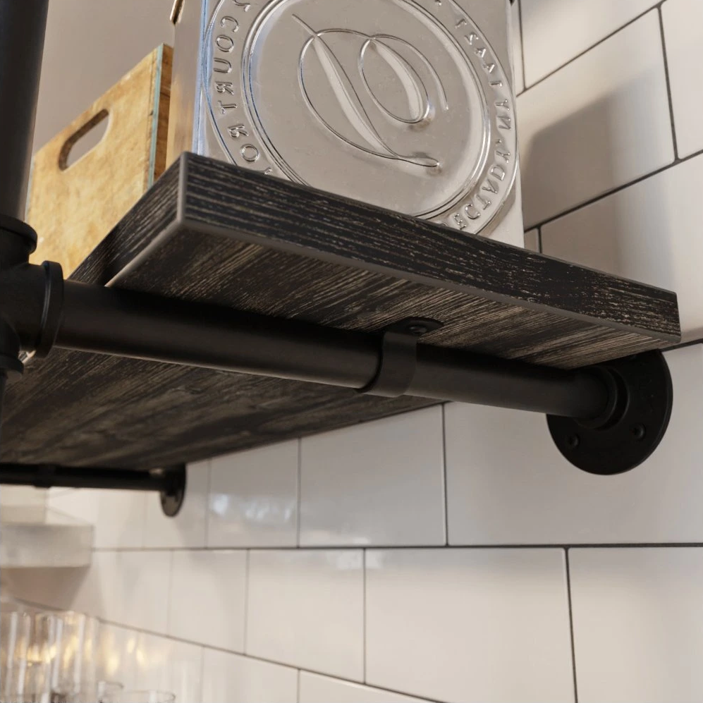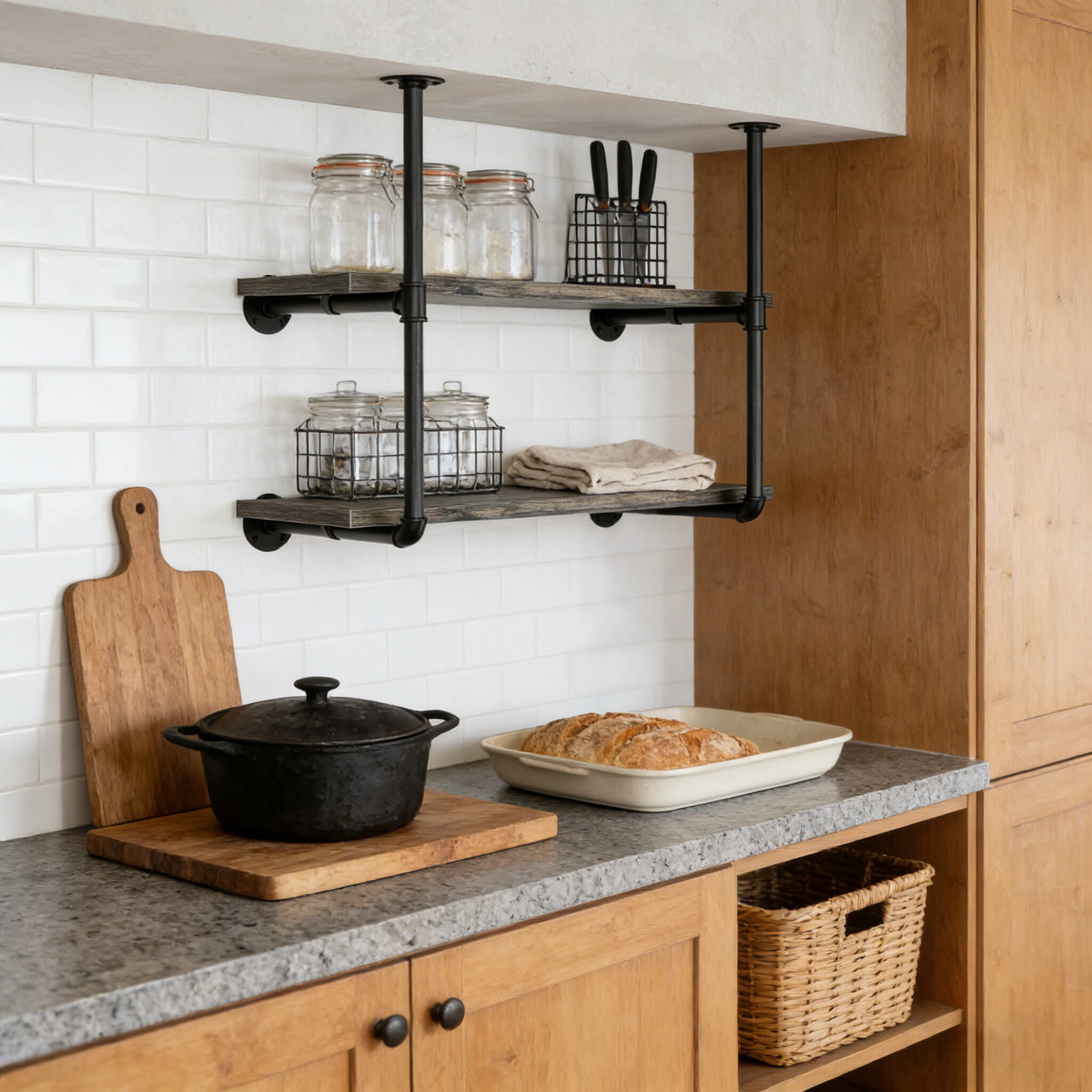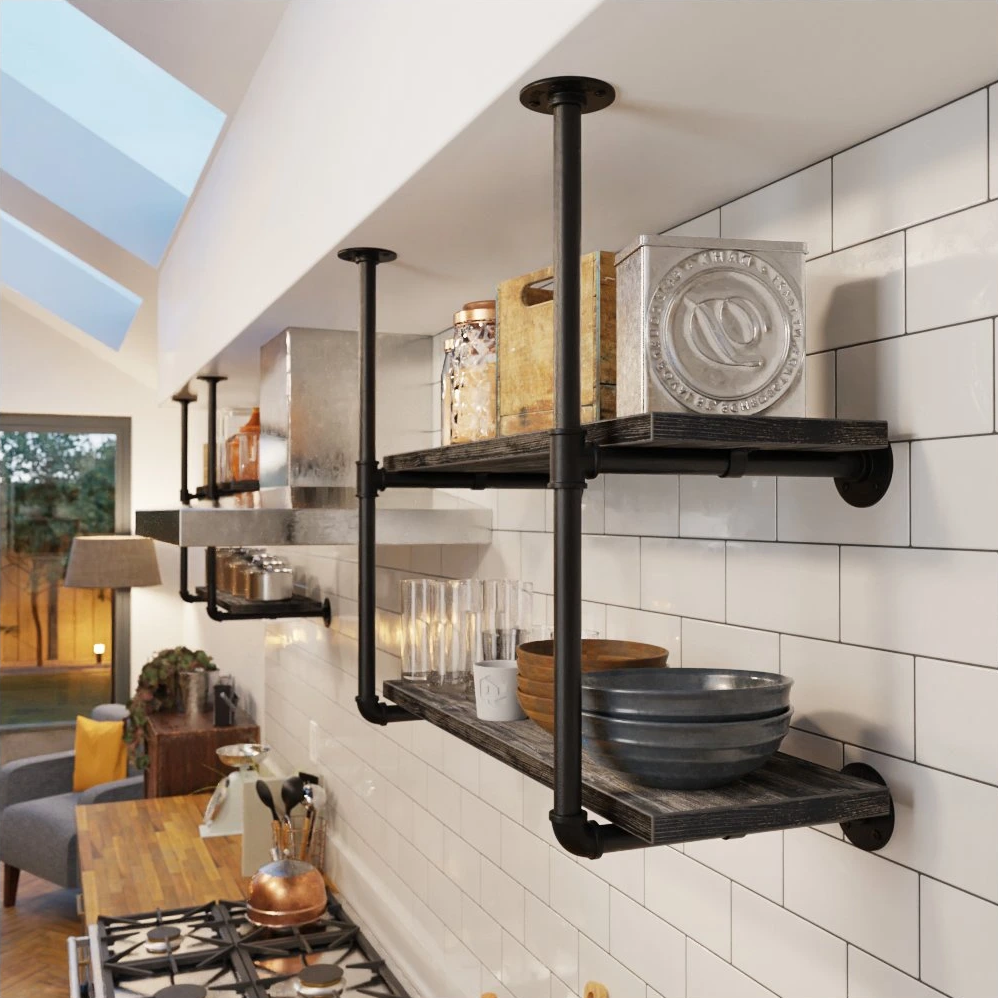 This ceiling-mounted rack is a versatile storage solution designed for efficient space optimization. Its unique double-layer design combines rustic wood shelves with industrial metal pipe brackets, allowing for easy hanging and organization of spices, mugs, or small decor items. Made from solid wood planks and durable iron piping, the unit is built to withstand daily use and provide reliable long-term support. Ideal for kitchens, living rooms, cafes, or studios, it offers a stylish and functional way to keep essentials within reach while freeing up counter and cabinet space.