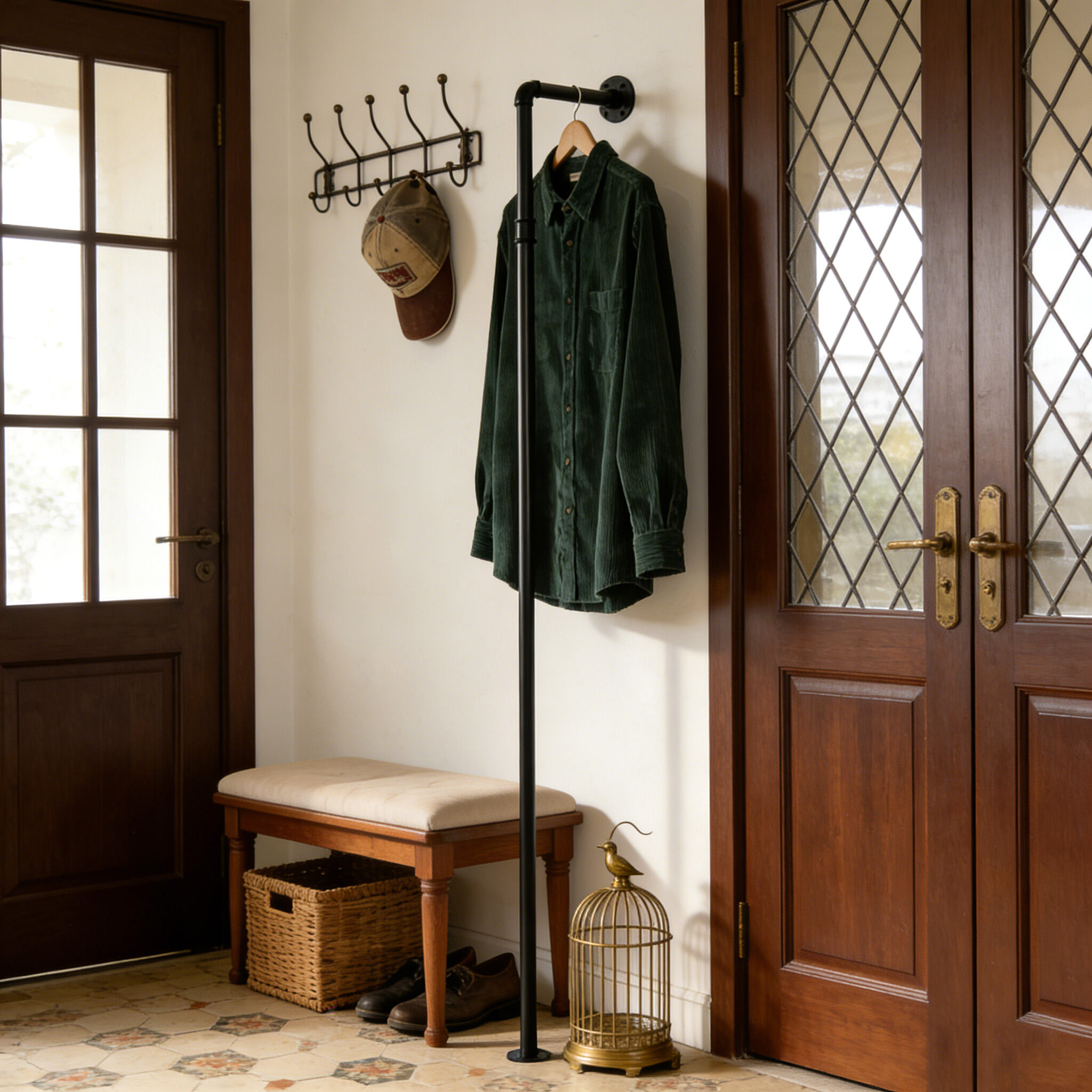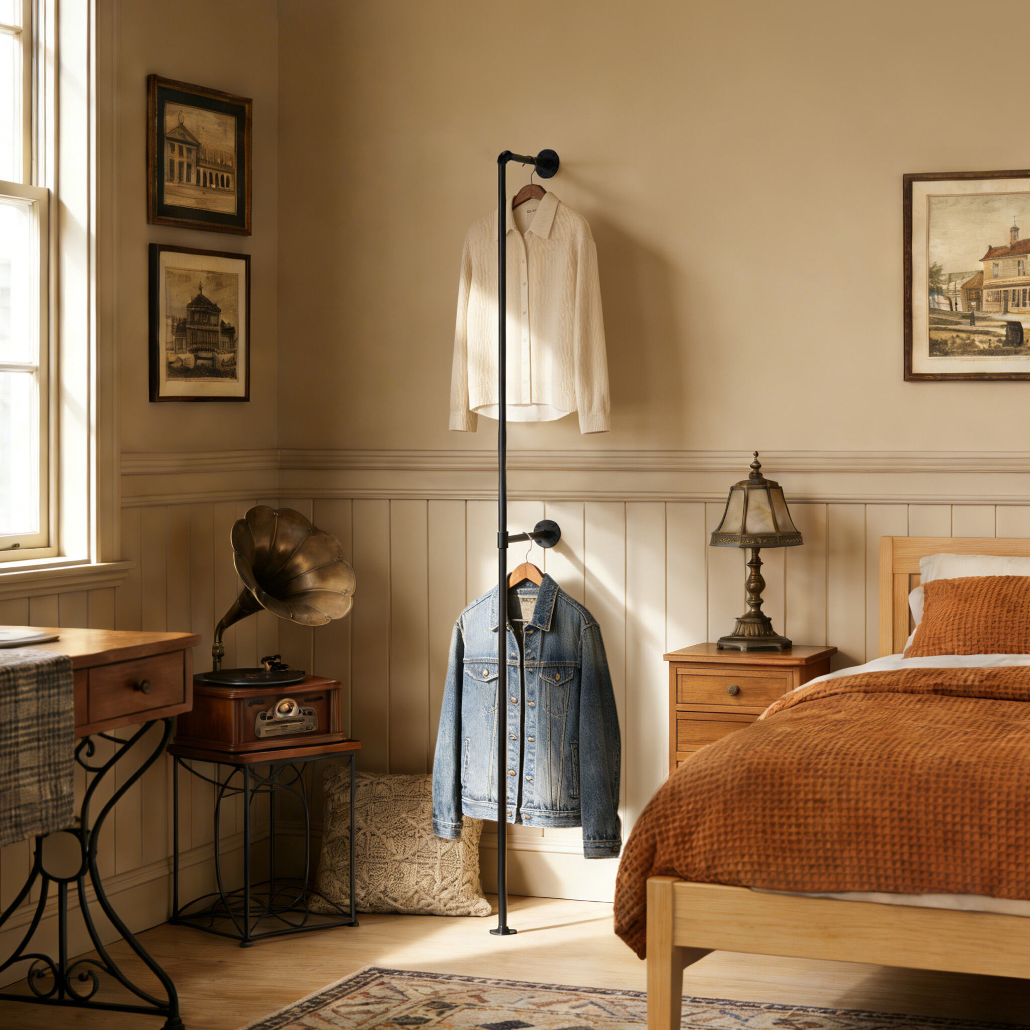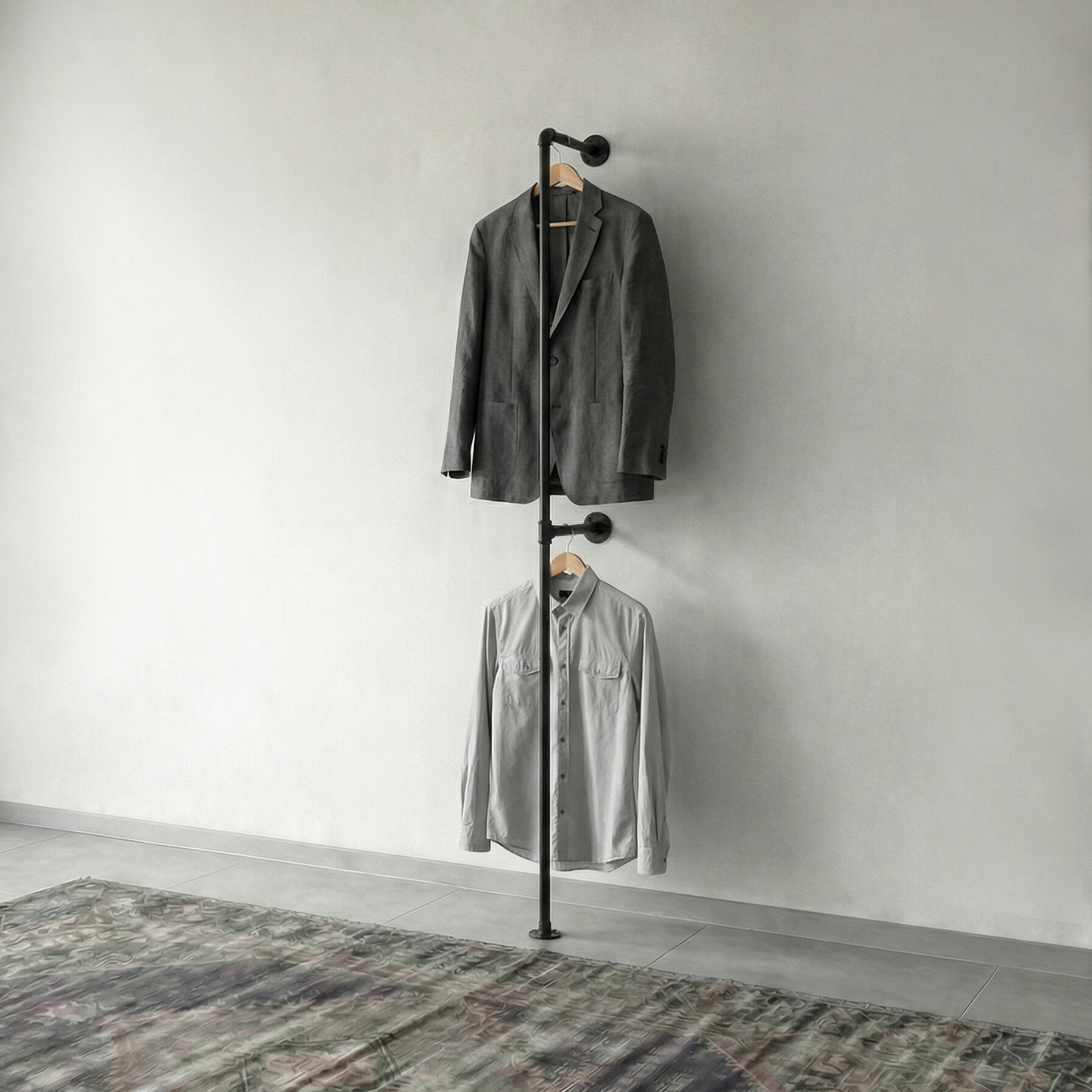 This industrial pipe clothes rack is a heavy-duty storage system designed for efficient overhead organization. Its ceiling-mounted design maximizes vertical space, providing a sturdy bar for hanging garments, laundry, or retail stock. Constructed from solid iron and industrial-grade piping, it is built to support substantial weight and ensure lasting durability. Ideal for open-plan homes, spacious closets, laundry rooms, or commercial spaces, this rack combines functional, rustic style with reliable performance for any high-capacity storage need.