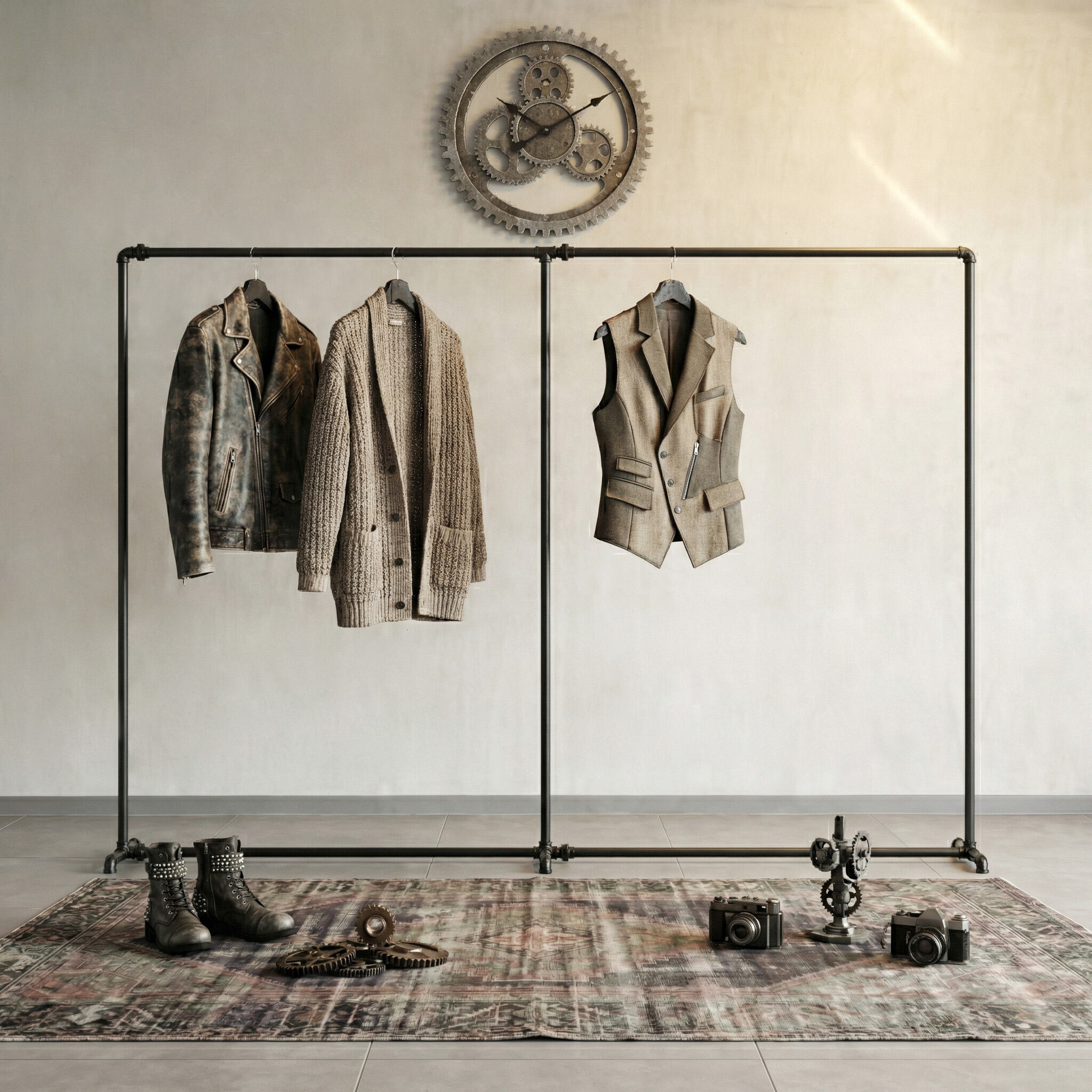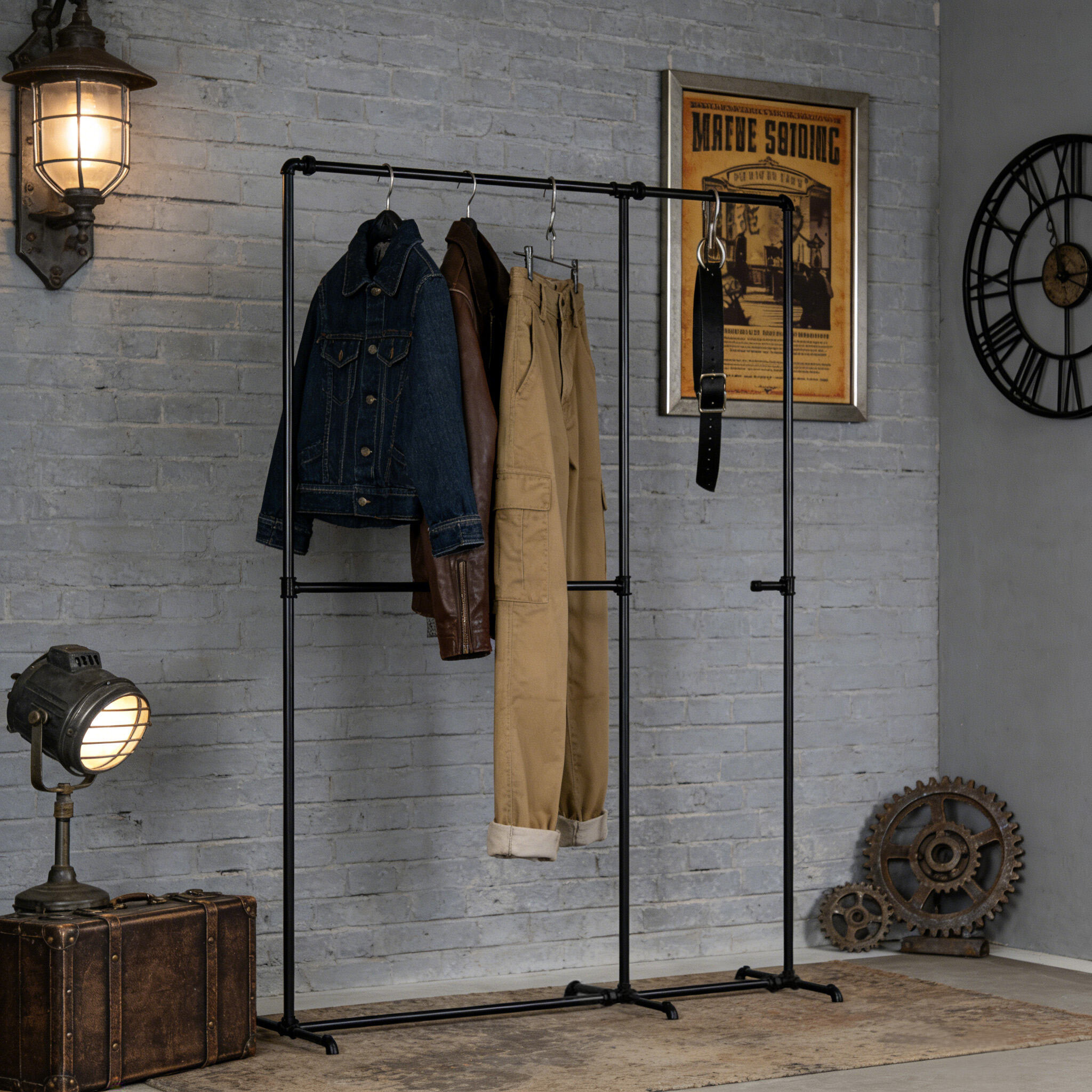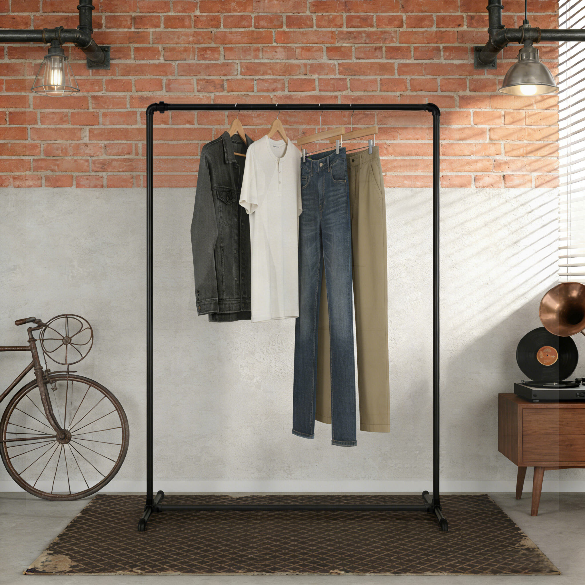 This industrial pipe clothes rack is a heavy-duty storage system designed for efficient overhead organization. Its ceiling-mounted design maximizes vertical space, providing a sturdy bar for hanging garments, laundry, or retail stock. Constructed from solid iron and industrial-grade piping, it is built to support substantial weight and ensure lasting durability. Ideal for open-plan homes, spacious closets, laundry rooms, or commercial spaces, this rack combines functional, rustic style with reliable performance for any high-capacity storage need.