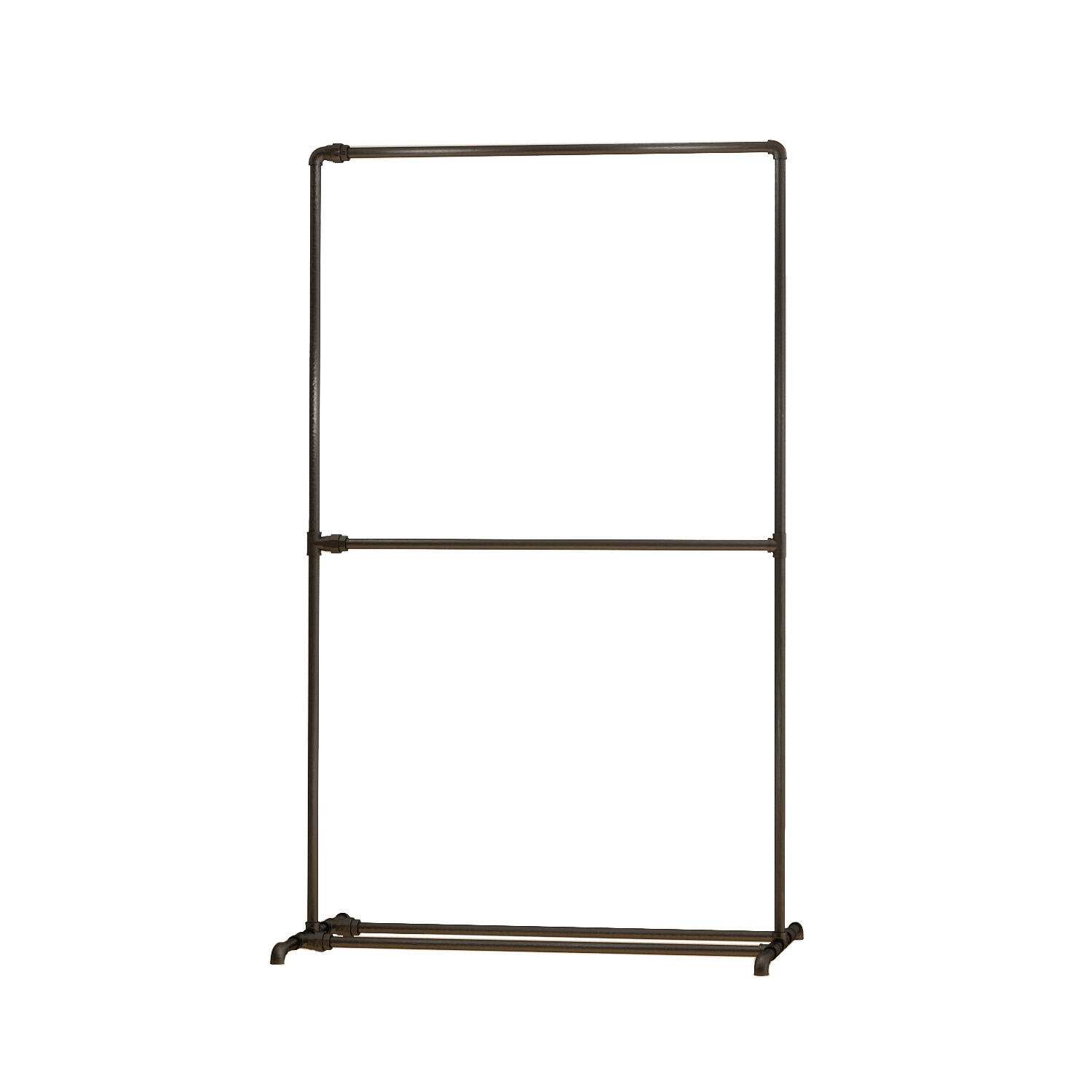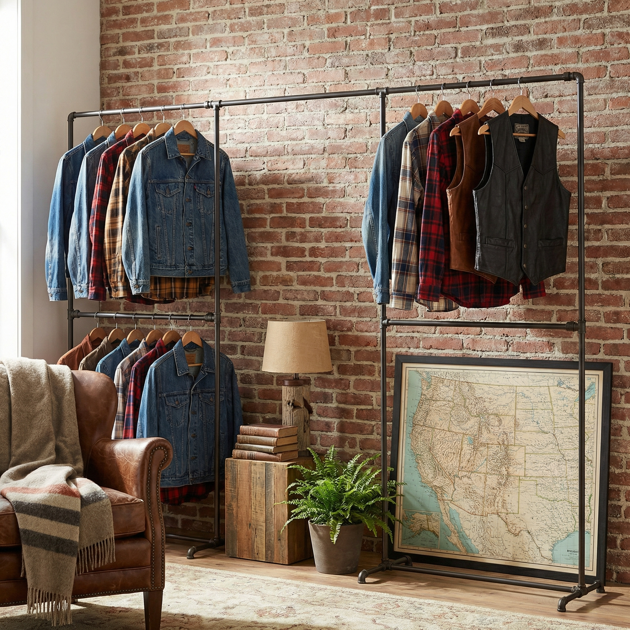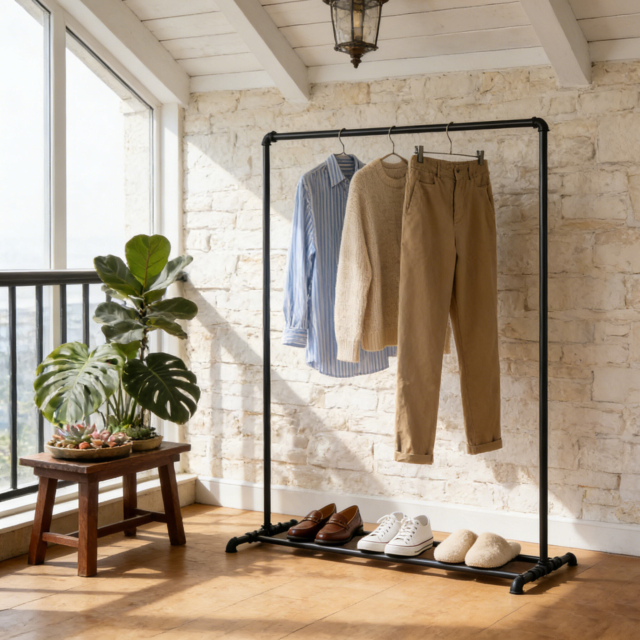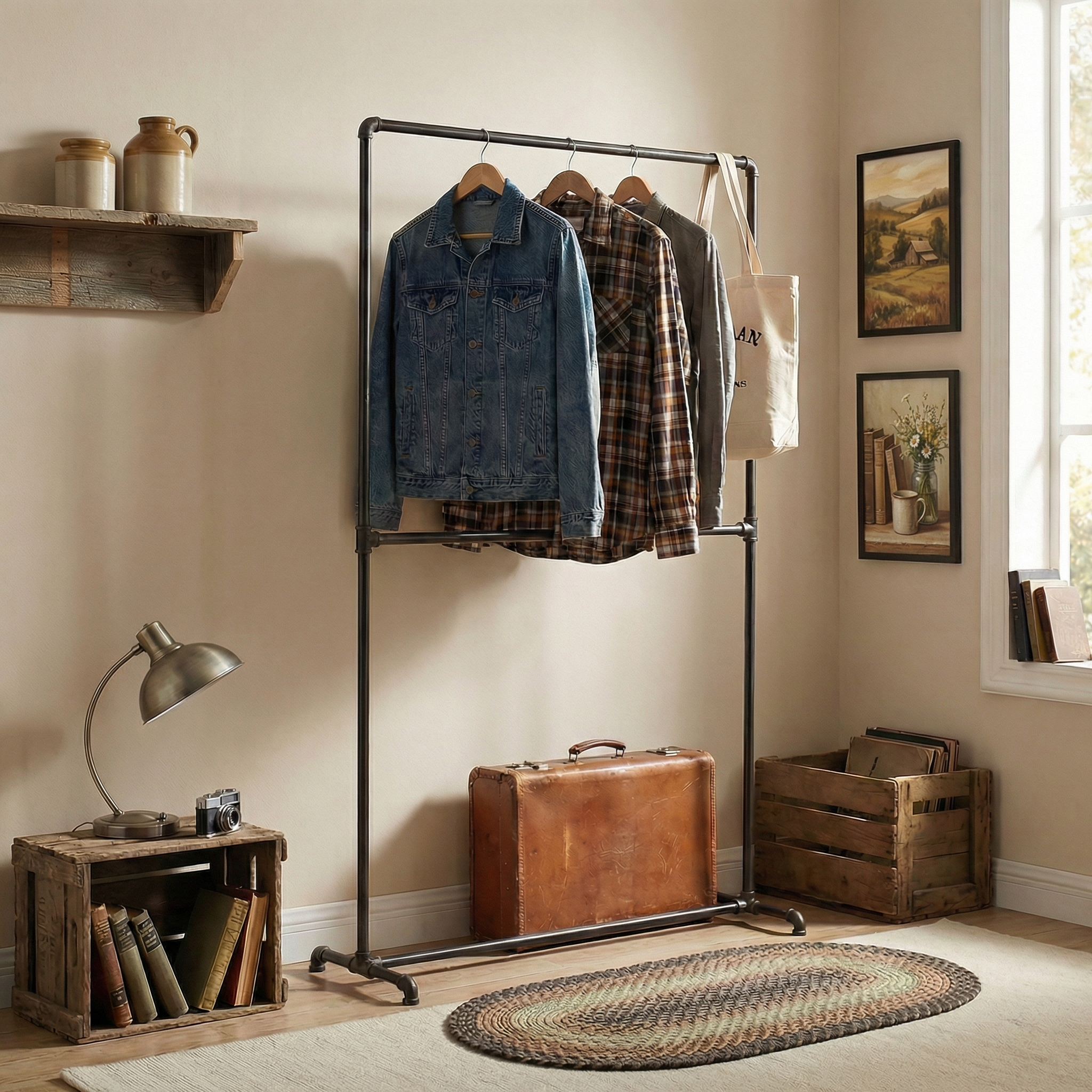 This industrial pipe clothes rack is a heavy-duty storage system designed for efficient overhead organization. Its ceiling-mounted design maximizes vertical space, providing a sturdy bar for hanging garments, laundry, or retail stock. Constructed from solid iron and industrial-grade piping, it is built to support substantial weight and ensure lasting durability. Ideal for open-plan homes, spacious closets, laundry rooms, or commercial spaces, this rack combines functional, rustic style with reliable performance for any high-capacity storage need.