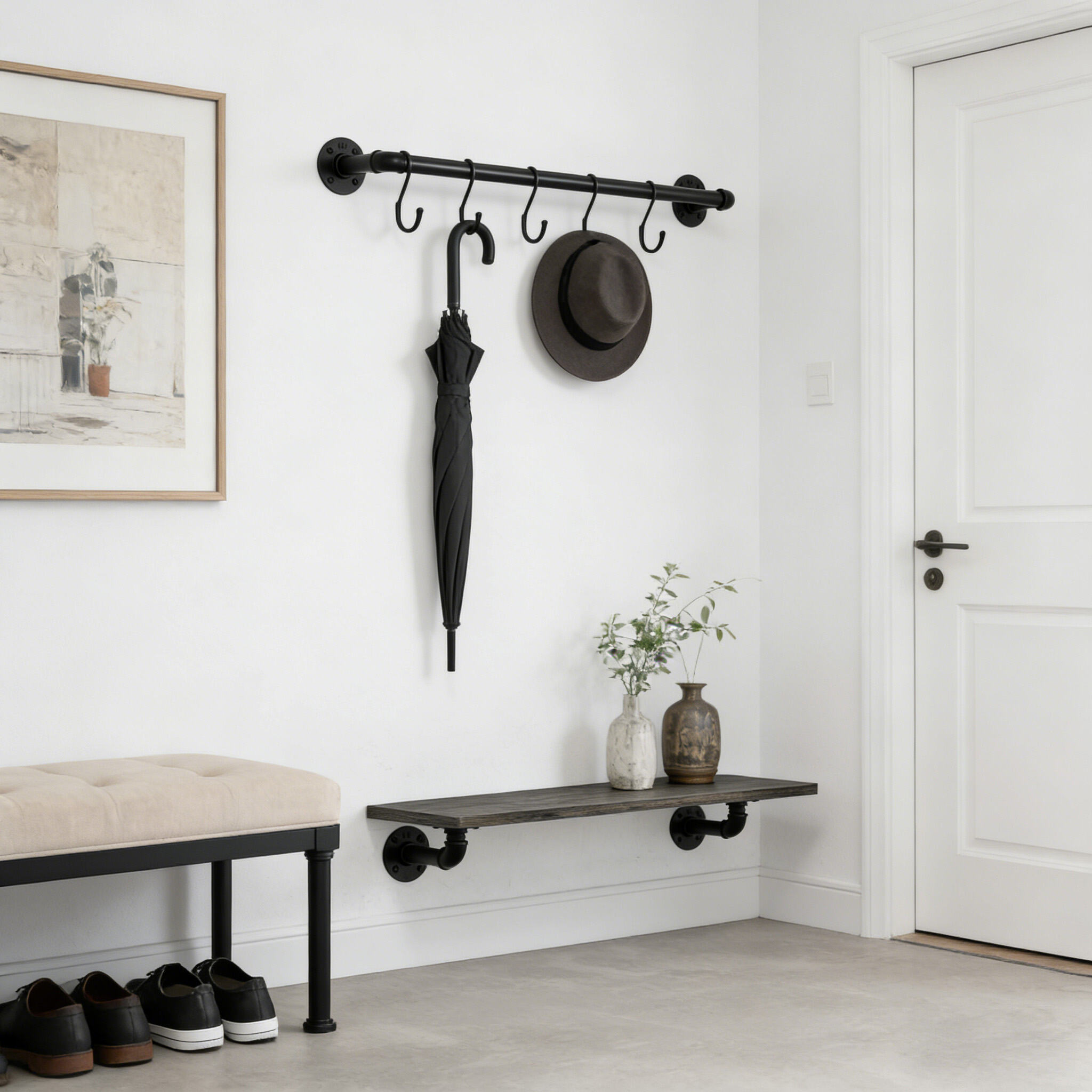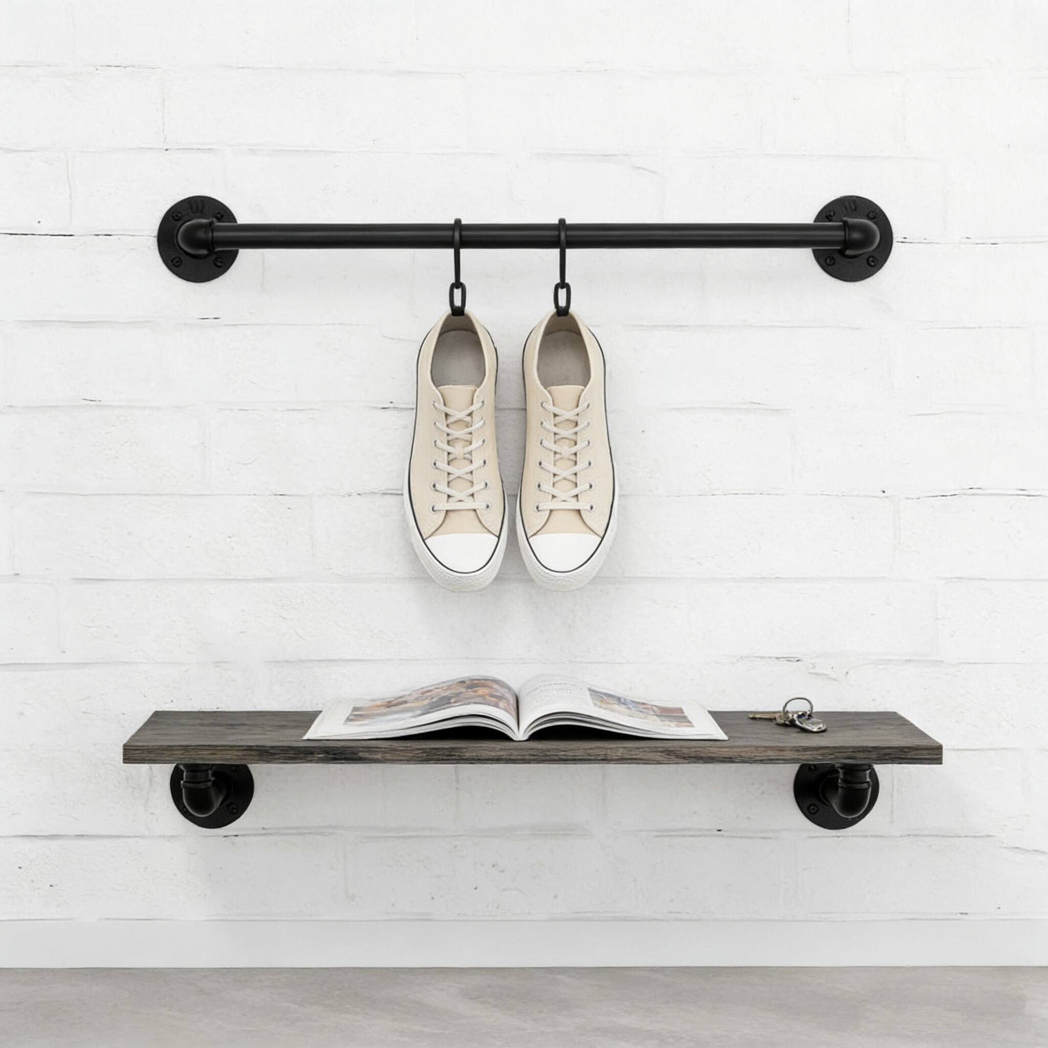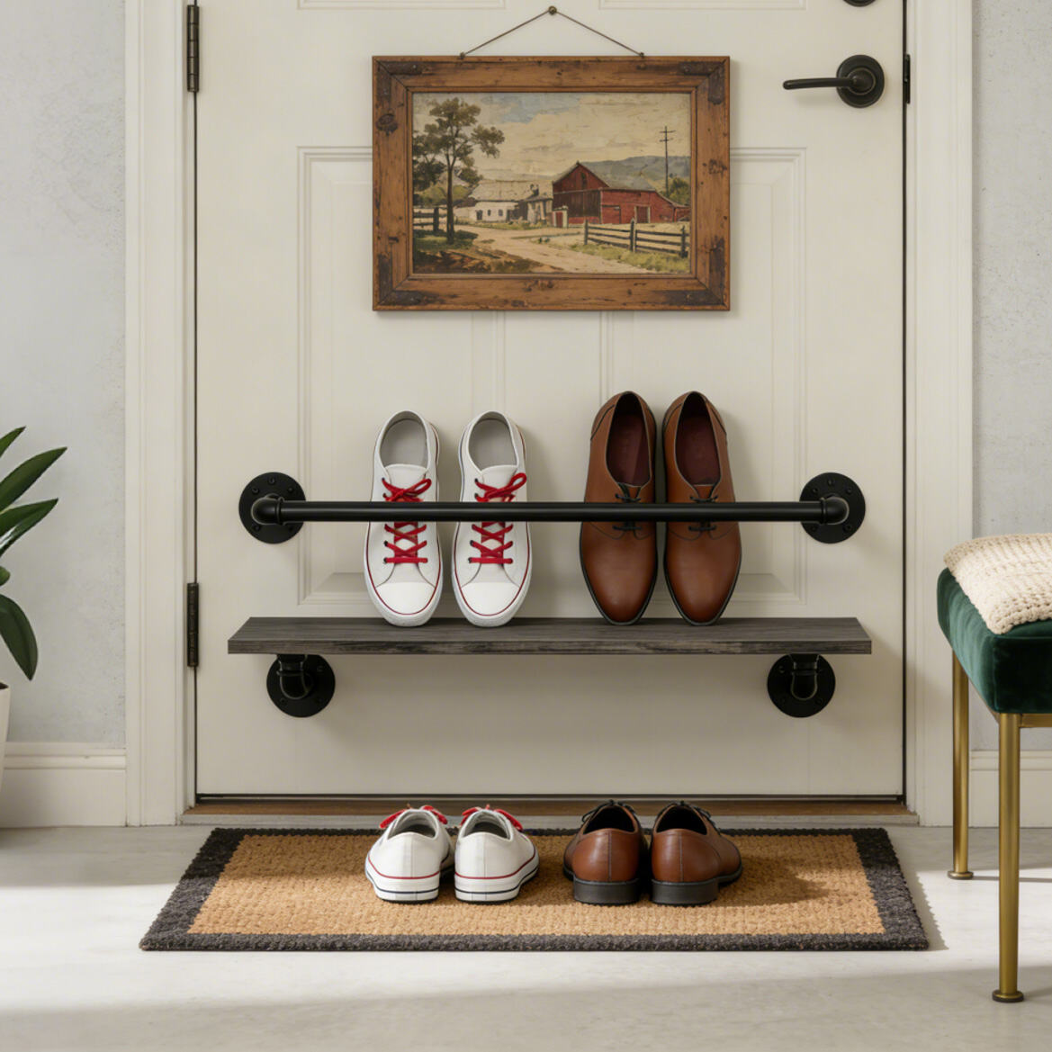 This rustic floating shelf unit is a versatile storage solution designed for practical and stylish organization. Its industrial pipe and wood design features durable MDF shelves paired with black metal brackets, creating an adaptable shoe rack that optimizes vertical wall space. Made from high-density MDF and heavy-duty iron piping, this unit is built to withstand frequent use and support substantial weight, ensuring long-lasting durability. Ideal for entryways, bedrooms, bathrooms, and kitchens, it combines rustic charm with modern utility to keep shoes, decor, or daily essentials neatly stored and easily accessible.