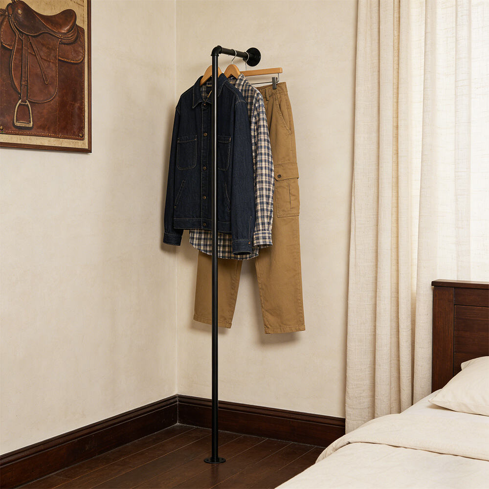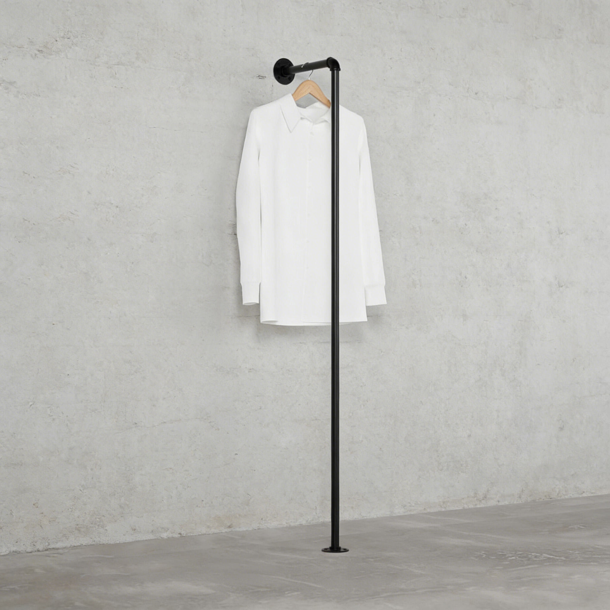 This industrial pipe clothes rack is a heavy-duty storage system designed for efficient overhead organization. Its ceiling-mounted design maximizes vertical space, providing a sturdy bar for hanging garments, laundry, or retail stock. Constructed from solid iron and industrial-grade piping, it is built to support substantial weight and ensure lasting durability. Ideal for open-plan homes, spacious closets, laundry rooms, or commercial spaces, this rack combines functional, rustic style with reliable performance for any high-capacity storage need.