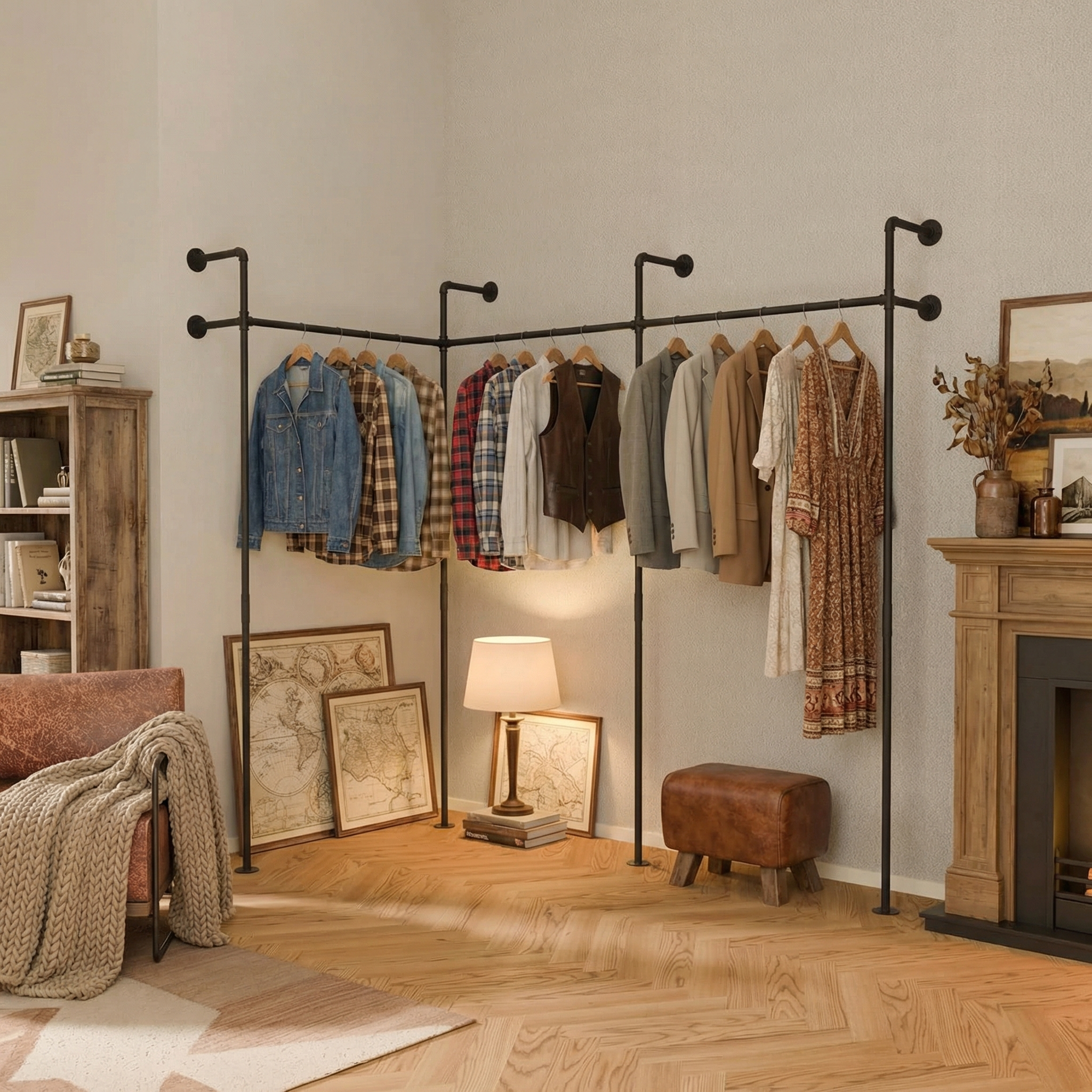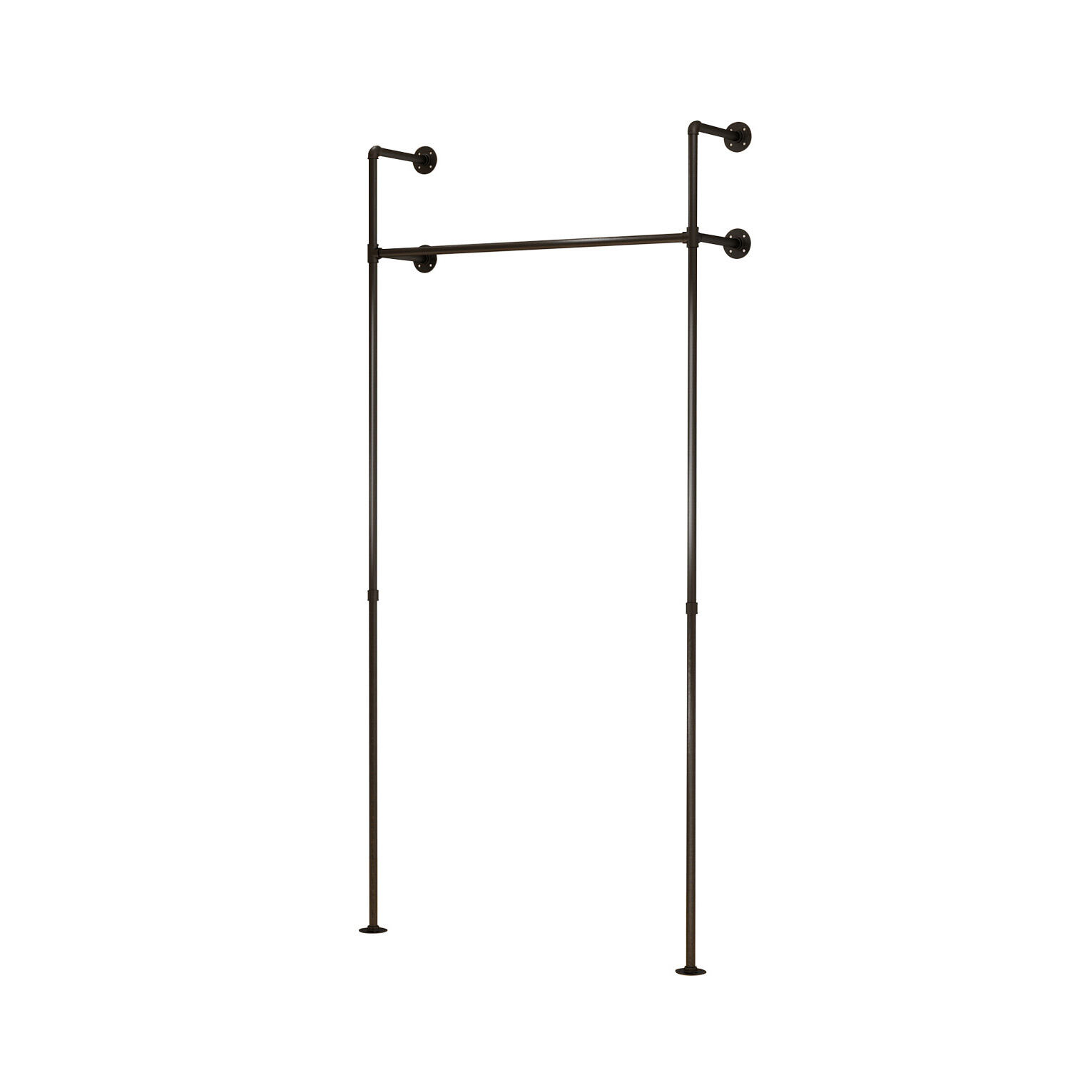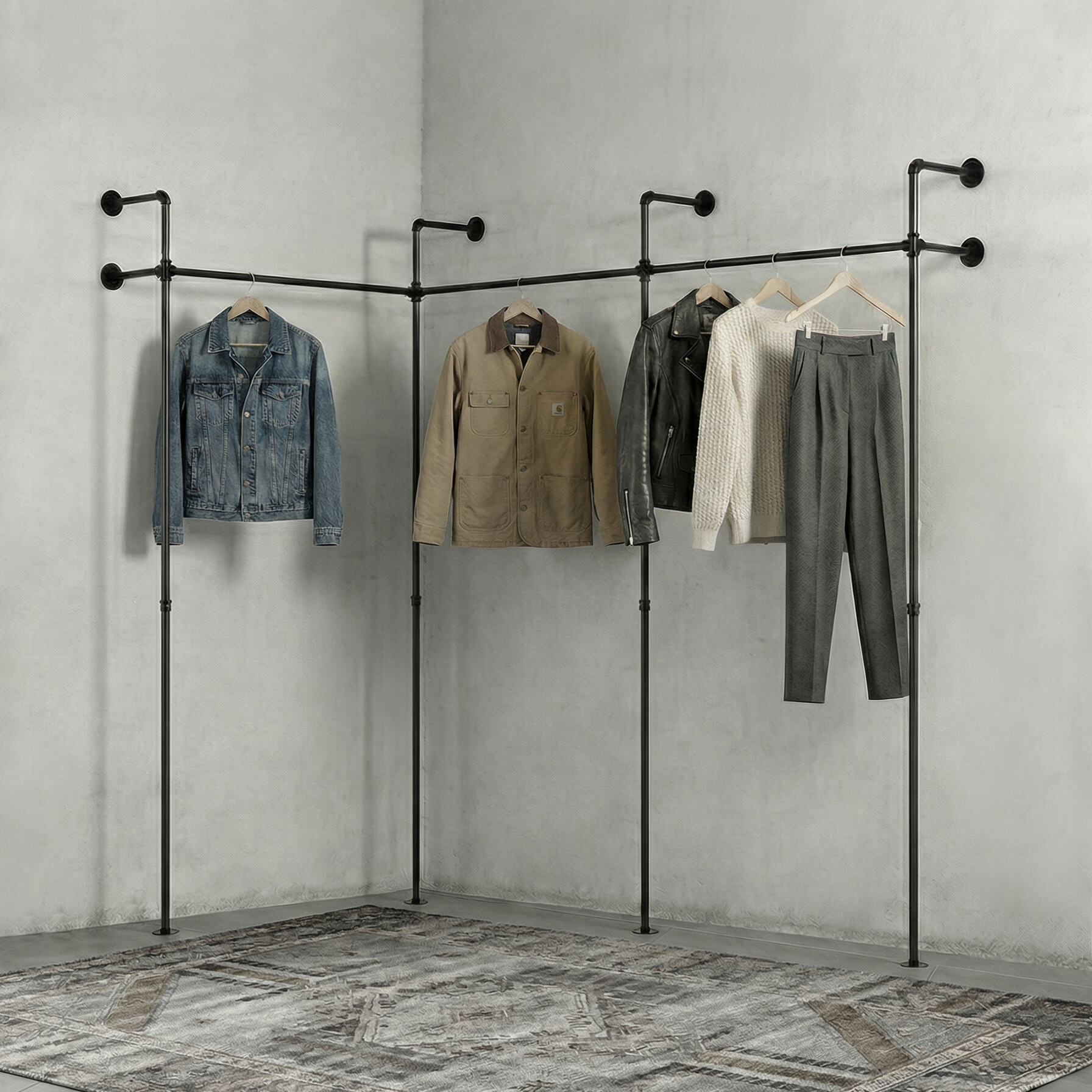 This industrial pipe clothes rack is a heavy-duty storage system designed for efficient overhead organization. Its ceiling-mounted design maximizes vertical space, providing a sturdy bar for hanging garments, laundry, or retail stock. Constructed from solid iron and industrial-grade piping, it is built to support substantial weight and ensure lasting durability. Ideal for open-plan homes, spacious closets, laundry rooms, or commercial spaces, this rack combines functional, rustic style with reliable performance for any high-capacity storage need.