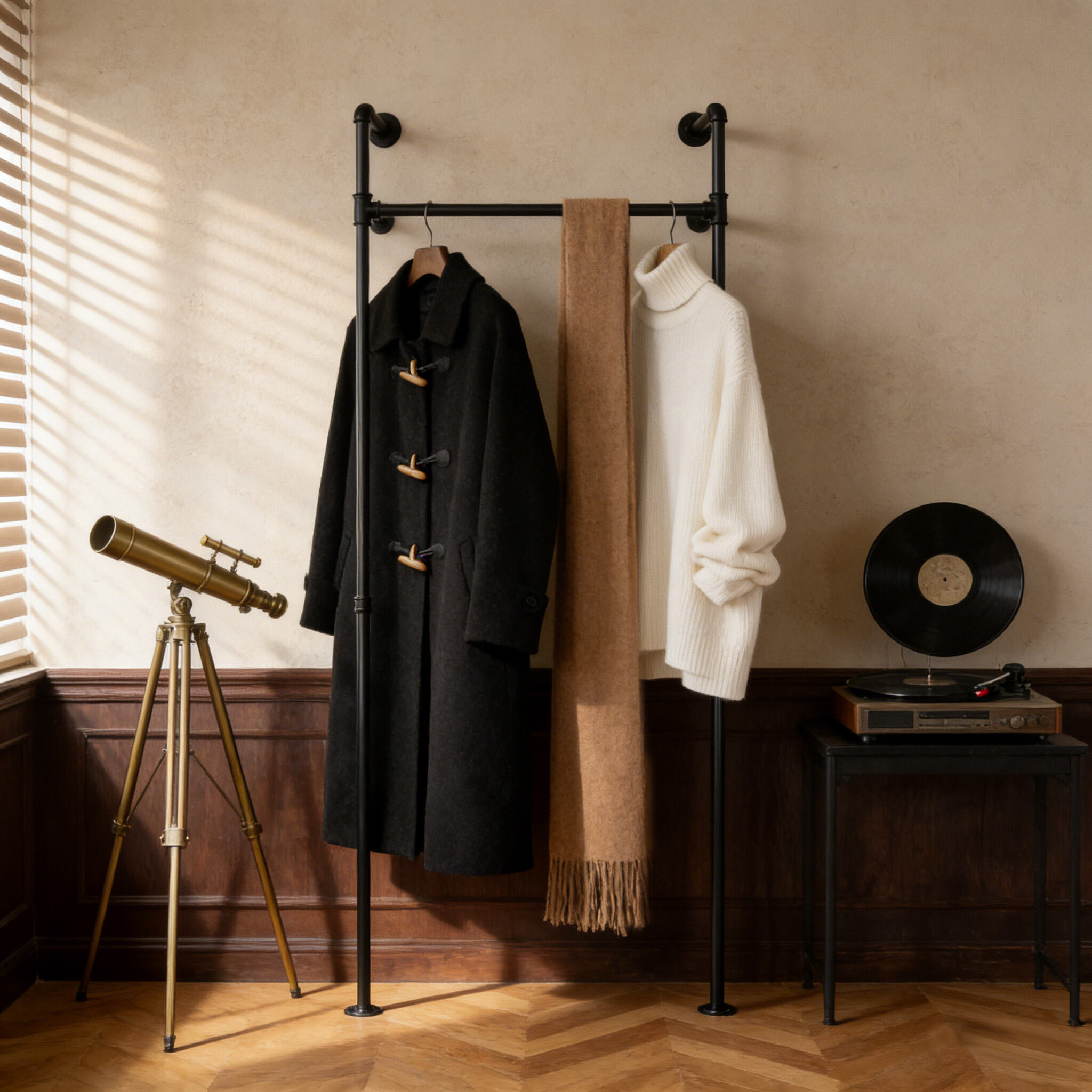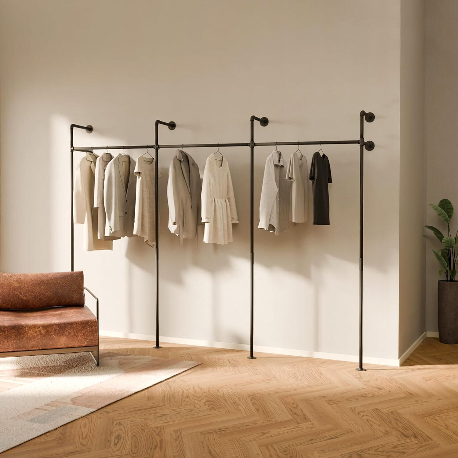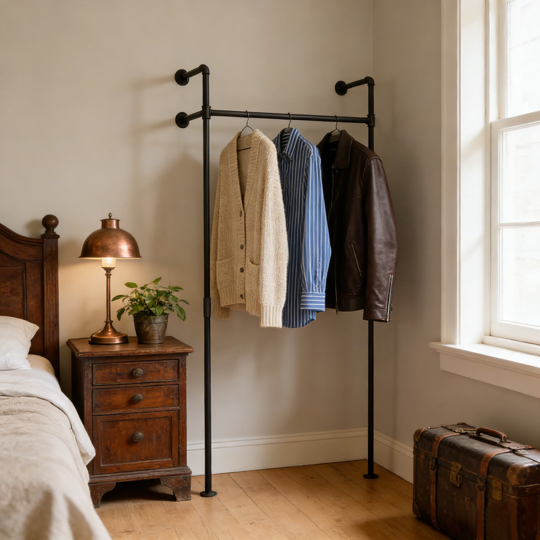 This industrial pipe clothes rack is a heavy-duty storage system designed for efficient overhead organization. Its ceiling-mounted design maximizes vertical space, providing a sturdy bar for hanging garments, laundry, or retail stock. Constructed from solid iron and industrial-grade piping, it is built to support substantial weight and ensure lasting durability. Ideal for open-plan homes, spacious closets, laundry rooms, or commercial spaces, this rack combines functional, rustic style with reliable performance for any high-capacity storage need.